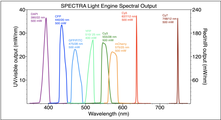 light source)的光谱输出参数图可以看出,Lumencor的SPECTRA多通道固态光源(multichannel