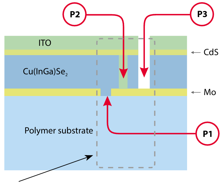 去除ZnO(1 μm)/CIGS/Mo/PI结构中的前触点。激光PL10100/SH,10 ps, 370 mW, 100 kHz, 532 nm;扫描速度4.3 m/s,单次扫描。