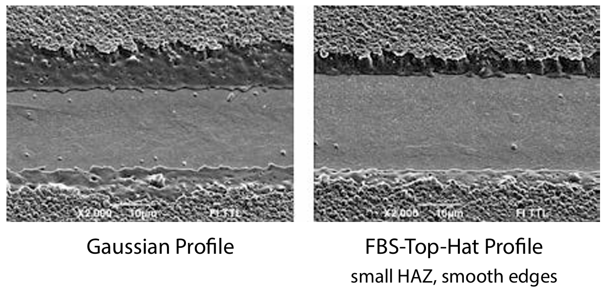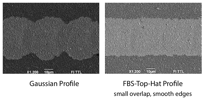 通过在聚焦透镜/物镜前的光束路径中引入Eksma光束整形器FBS,将初始衍射受限的高斯光斑转化为均匀的Top-Hat轮廓。