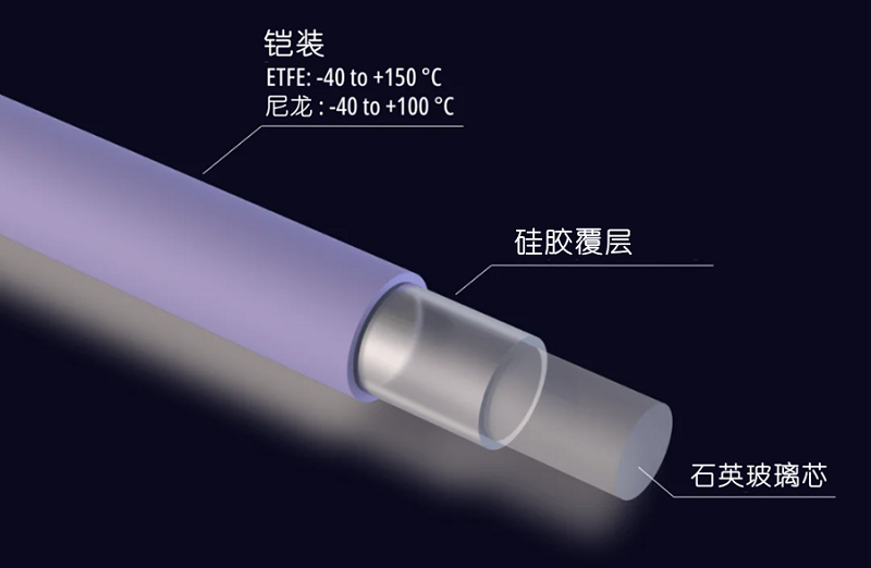 铠装: A=丙烯酸酯护套(无缓冲);F=PFA Fluon®;N=尼龙护套(硅胶或硬质聚合物护套);T=ETFE护套(硅胶或者硬质聚合物缓冲);P=聚酰亚胺护套(无缓冲)