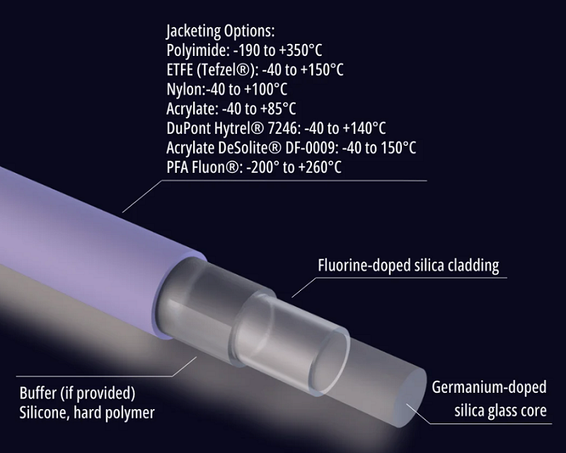 Armadillo提供多种特种光纤,覆盖350nm至2400nm的宽广光谱。其石英光纤系列(硬质聚合物包层石英光纤,硅包层石英光纤,掺锗石英光纤)具备0.37至0.57的大数值孔径。此外,公司还提供适用于400nm-700nm可见光波段的硼硅酸盐光纤,其标准数值孔径范围为0.22-0.57,特殊定制型号NA可达0.87,纤芯直径可在25-100μm之间选择。大数值孔径光纤适用于照明、医疗、光谱学等不同应用。