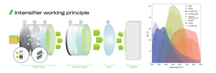 在光电阴极(1)上,光子被转换成电子。这些电子在电场中被加速向多通道板(MCP)(2)并撞击通道壁。根据通道两端的电压,次级发射产生多个电子。这团电子加速向阳极屏(3),在那里,电子通过磷光层被转换成光子。这些光子通过光纤面罩被引导到第二级(助推器)的入口。然后,光子通过光电阴极(4)被转换成电子,并被加速到阳极屏幕(5),图像就在那里出现。中继透镜(6)将图像从增强器的背面转移到安装的相机上。右图为像传感器对应不同波段的量子效率图。