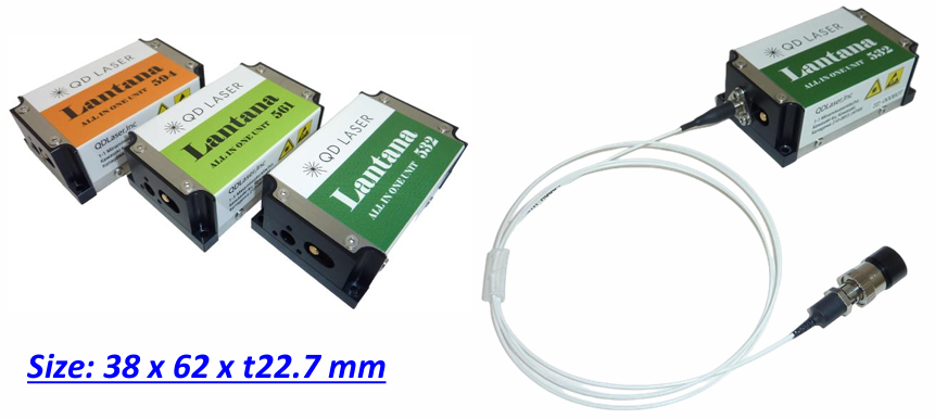 日本QD LASER推出了一系列紧凑型可见光激光器,包括紧凑型激光模块、半导体激光器及Lantana™系列产品。这些激光器体积小巧,专为生物医学检测、流式细胞分析和拉曼光谱等精密光学应用而设计。产品具备超小体积、高稳定性单频输出及低功耗特性,支持连续波(CW)与脉冲驱动模式,提供光纤尾纤(SMF/PMF)及集成驱动盒等多种配置,满足不同系统的集成需求。开发中的488nm、552nm、588nm波长计划于2025年提供样品。