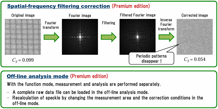 高级版支持空间频率滤波校正,能有效去除图像中的周期性图案,如下图3,原始图像经过傅里叶变换后得到频域图像,经过滤波处理后逆傅里叶变换得到最后的校正图像,CS由原图的0.099变换到校正后的0.054;离线分析模式可单独进行测量和分析,允许加载完整的原始数据文件,并能在离线状态下通过改变测量区域和校正条件重新计算散斑。