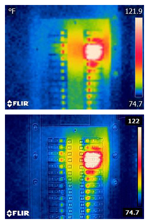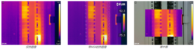 FLIR红外热像仪MSX®热图像增强。MSX可将内置可见光相机拍摄的关键细节信息实时添加至整幅红外热像中。结果:提供含完整编号、标签和其它结构特性的多合一热图像,因此,FLIR红外热像仪可以立即识别热点问题所在。
