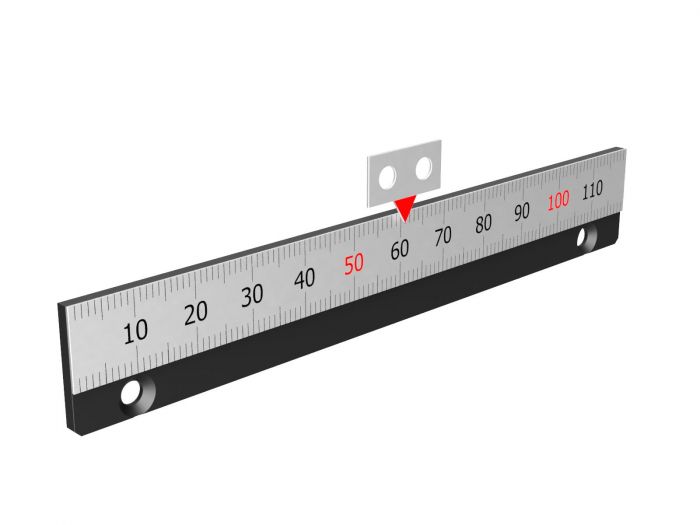 刻度尺TSO-60SC1是目视确认易操作型大行程手动平台(TSO-601M)的滑台位置用刻度尺。刻度尺全长120mm、刻线间隔1mm。将刻度尺的刻线部分安装到易操作型大行程手动平台(TSO-601M)的侧面,同时将位置指示板安装到滑台的侧面。平台的左侧和右侧,都准备了同样规格的安装孔,可任意选择安装位置。其刻度值可大致判断滑台的当前位置。