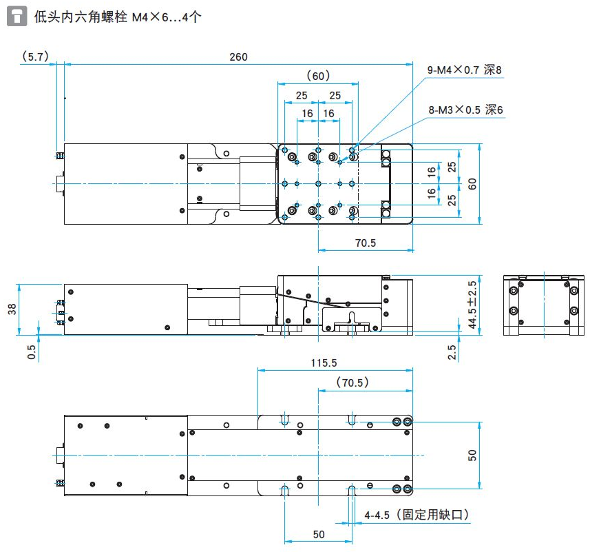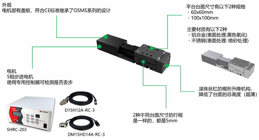 OptoSigma光栅尺自动滑台主要部件为十字交叉滚柱导轨(无滑动型)和滚珠丝杠的楔形升降机构,降低了台面的总高度(超薄)。在额定载荷下,即使电机断电,也能保持当前位置(防止断电自行下滑)。从提高可用性的观点出发,实现了基于AutoConfig功能的平台分辨率自动识别。10nm薄型ZF轴闭环控制平台材质有铝合金和不锈钢2种不同型号可选。台面尺寸有60mm×60mm或100mm×100mm两种台面尺寸可选,行程都是5mm。