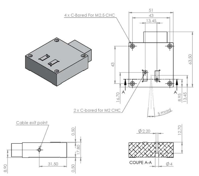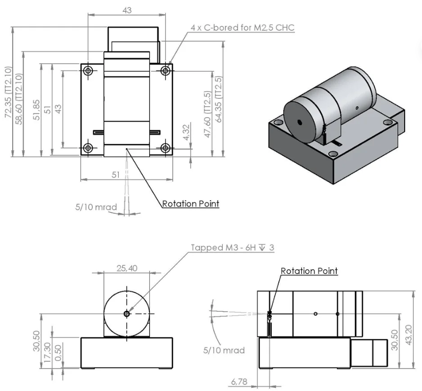 法国PIEZOCONCEPT的TT系列高速纳米压电偏转台一共有单旋转轴向TT1.5和TT1.10两款,二旋转轴向TT2.5和TT2.10两款。TT系列快速压电偏摆台的行程分为5 mRad和10 mRad,轴向控制数量相同的型号外形规格没有很大的差别。TT1.5,TT1.10,TT2.5,TT2.10这四款压电快反镜的底座的规格是相同的。PIEZOCONCEPT提供的公制面包板适配器可以将TT1.5,TT1.10,TT2.5,TT2.10这四款压电镜片偏摆台顺利的安装在标准的M6通孔光学平台上。