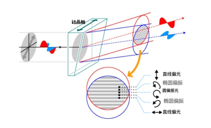 在光束重叠区域形成连续变化的偏振态序列:P线偏振→椭圆偏振→圆偏振→椭圆偏振→S线偏振→...