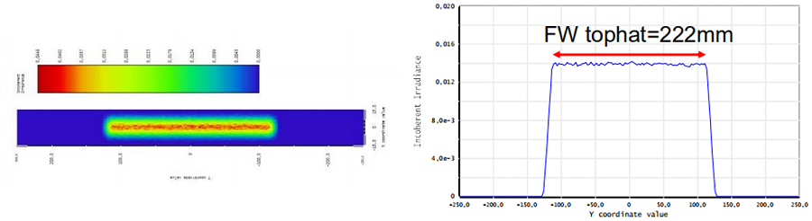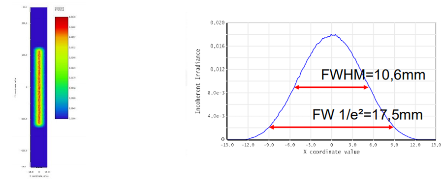 (2)Diffuser扩束后0.2米远处,面空间分布模拟(左)和长轴光斑尺寸强度分布曲线(右)