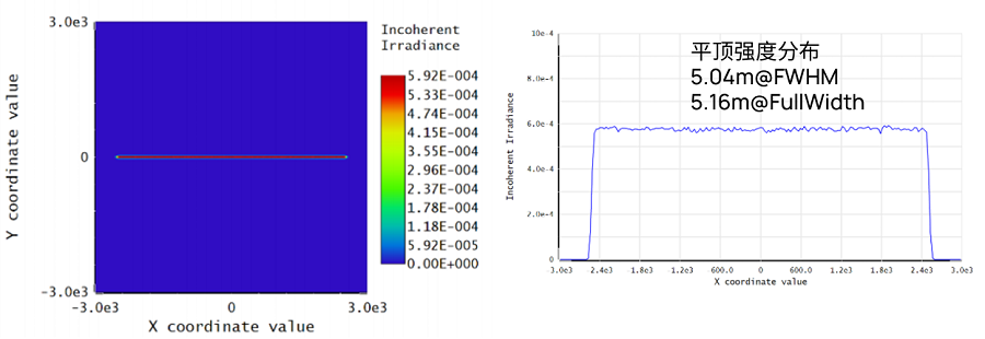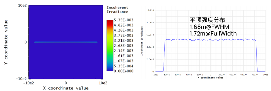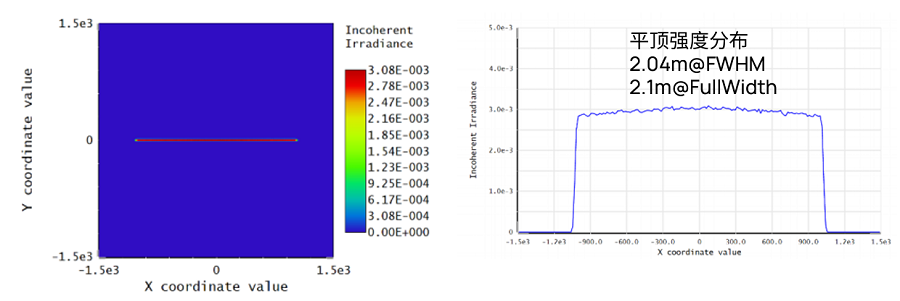 (2)Diffuser扩束后1米远处,面空间分布模拟(左)和光斑尺寸强度分布曲线(右)