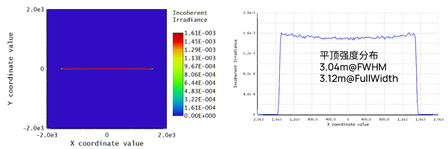 (3)Diffuser扩束后3米远处,面空间分布模拟(左)和光斑尺寸强度分布曲线(右)