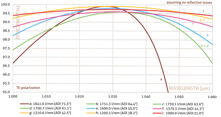 不同的线密度和入射角度,使得1030nm光栅的衍射效率在宽波段范围不一样,但是在中心波长1030nm都是≥99.5%,用户可根据需求选择合适的规格。