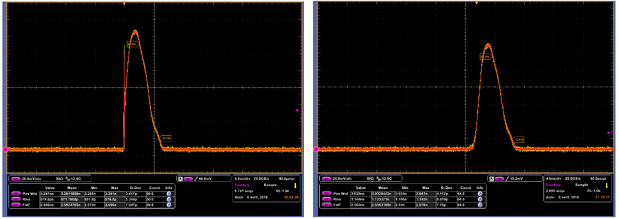 为此,AeroDIODE推出了另一款高性能产品“Pulse-Shaper”脉冲整形器。它内置任意波形发生器(AWG),能以48dB的幅度分辨率和500皮秒的时间分辨率对激光二极管输出进行精确整形。图中展示了由其驱动的DFB激光二极管产生的3ns脉冲:左图存在增益开关尖峰,右图则通过激活内置的“增益开关尖峰抑制”功能消除了该尖峰。