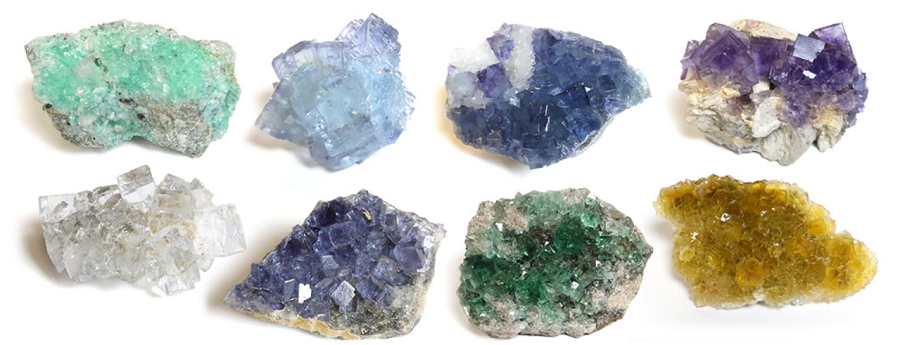 萤石晶体的原子和分子在空间中以立方晶系(立方格子结构)的重复模式排列。该矿物具有完全解理性,若沿特定方向破碎低折射率萤石晶体,会获得八面体状碎片。