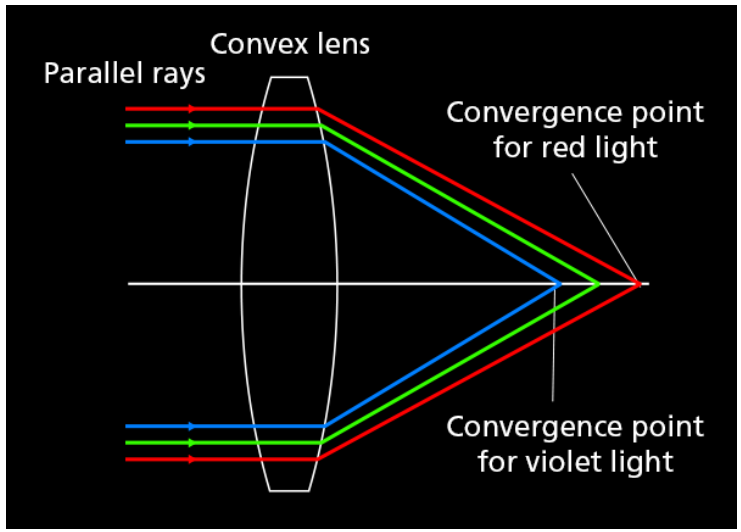 光线穿透水或其他透明介质时会发生折射。透镜正是利用这一特性使光线汇聚至特定焦点。然而,光的折射程度随颜色而异,不同波长的光线会聚焦于不同位置,这种现象称为色差。