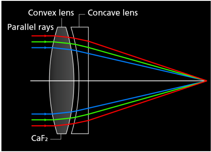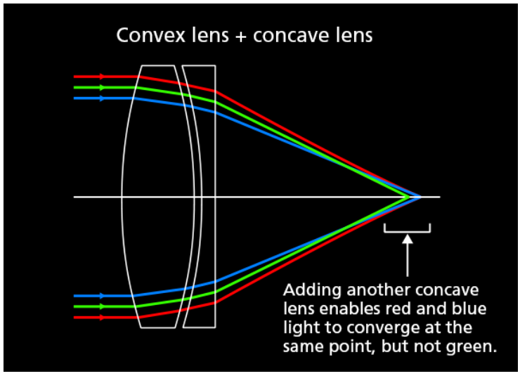 玻璃凸透镜+凹透镜组合,红色与蓝色波长光线被校正至同一点汇聚,而绿色波长光线仍存在汇聚差异