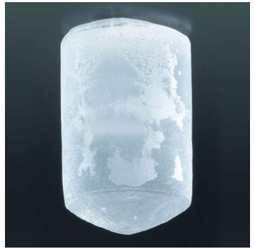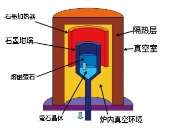 提纯后的萤石颗粒放入坩埚熔融,通过坩埚下移实现自底部开始的结晶过程。再结晶可进一步去除杂质,形成高纯度晶锭。