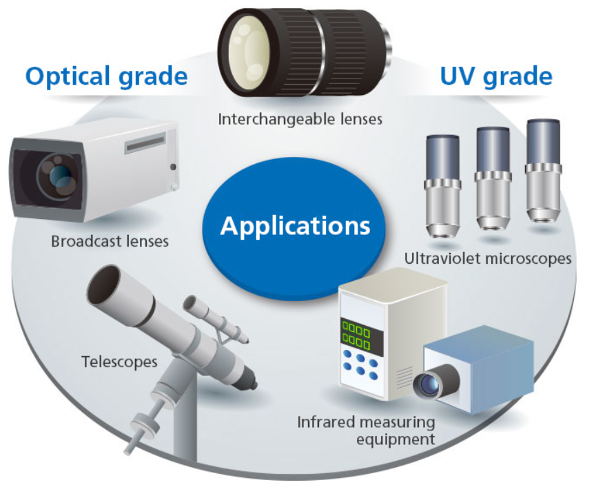除可换镜头相机的长焦镜头外,萤石晶体的色差校正能力还广泛应用于广播摄像镜头、天文望远镜及其他光学仪器与科学设备。