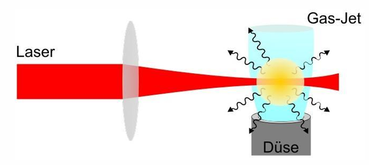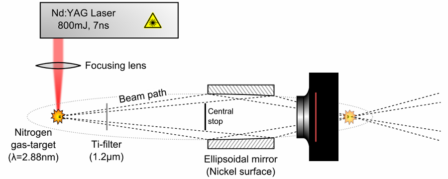 通过将强Nd:YAG激光聚焦到脉冲气体靶中,可以点燃一个极紫外EUV等离子体。该光源在13.5 nm波长处可提供约4 mJ的脉冲能量,重复频率为1-10 Hz。其最显著的特点之一是结构紧凑,允许在实验室环境下进行EUV实验。经过优化的喷嘴几何形状可实现高达0.45%的转换效率。此台式极紫外与软X射线等离子源由哥廷根激光实验室(Laser-Laboratorium Göttingen)开发。等离子体由一台1064 nm, 800 mJ, 7 ns 的Nd:YAG激光器聚焦到脉冲气体射流中产生。可使用不同的靶气体来分别产生强宽带辐射(XUV:氪 Kr, 氩 Ar; EUV:氙 Xe)或较弱但窄带的辐射(XUV:氮 N; EUV:氧 O)。该等离子光源规格参数如下: