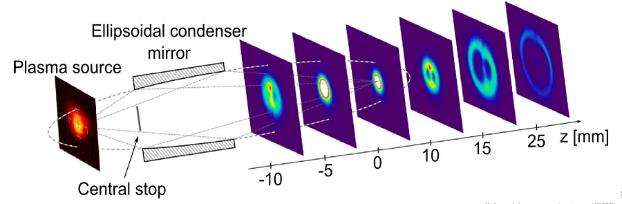 上图为通过椭圆透镜软X射线聚焦草图,通过激光粉图层CCD捕捉到以下的强度分布图。后续可通过软X射线显微镜得到如下所示的光束型状。