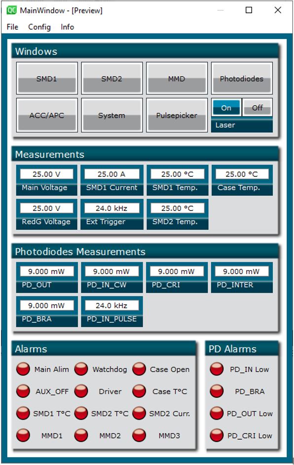 AeroDIODE光纤半导体激光驱动器图形用户接口控制2个半导体激光管驱动器、6个光电二极管、20个警报器和联锁等。警报器和联锁的相应时间为2ns。