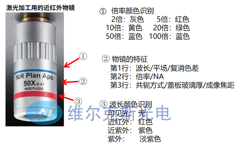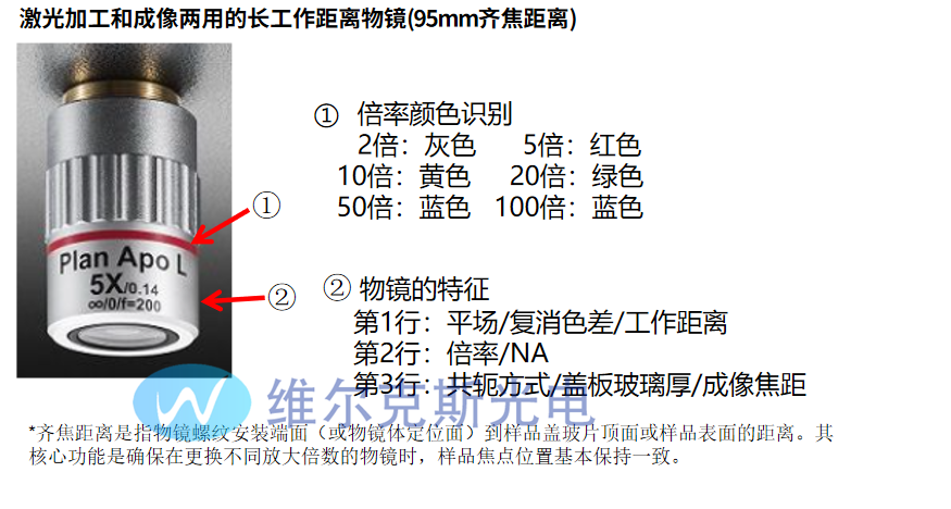 如图1左图:物镜文字上方的浅蓝色色环代表该物镜的放大倍数是50倍;物镜文字下方的红色色环代表物镜的工作波段为近红外波段;NIR也表示物镜的工作波段为近红外波段;Plan Apo表示物镜对场曲和像差进行了校正;“0.67”代表物镜数值孔径;∞代表该物镜是为无限远光学系统设计的;“0”表示该物镜不需要盖玻片(盖玻片厚度为0);f=200代表管镜焦距为200mm,又因为放大倍率50倍,因此物镜的焦距为200mm/50=4mm。图1右图:物镜文字上方的红色色环代表该物镜的放大倍数是5倍;Plan Apo表示物镜对场曲和像差进行了校正;“L”代表该物镜为长工作距离物镜;“0.14”代表物镜数值孔径;∞代表该物镜是为无限远光学系统设计的;“0”表示该物镜不需要盖玻片(盖玻片厚度为0);f=200代表管镜焦距为200mm,又因为放大倍率5倍,因此物镜的焦距为200mm/5=20mm。