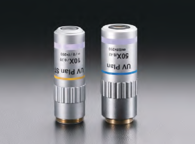 在物镜命名上的意义:普通光学玻璃会强烈吸收紫外光,导致UV光无法透过物镜。因此,标有UV或NUV的物镜采用特殊材料(如熔融石英、氟化钙)和镀膜,能够高效透过紫外光并对其精确聚焦,同时校正紫外波段产生的色差。