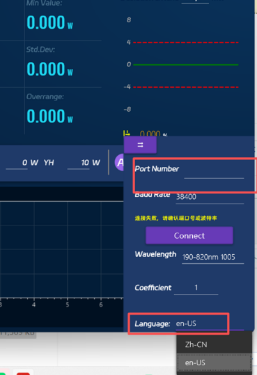 注意,如果想要将语言切换成英文,首次打开激光功率传感器软件,可以在通讯设置选择英文,设置端口和相应的波特率,软件显示连接上就可以正常使用。