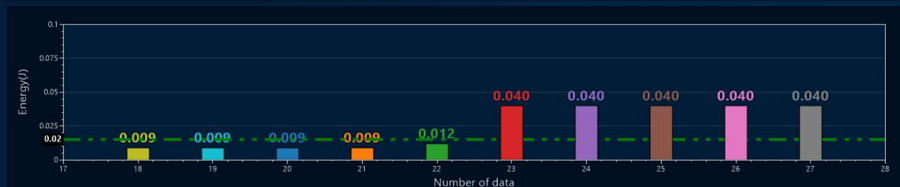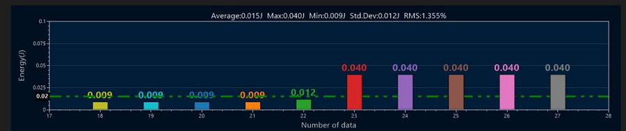 能量图表:如图13,能量图用柱形图显示每个能量脉冲的能量大小,勾选刷新后,每采集到一个数据,就会在最后显示最新的能量柱状图。注:虚线为平均值。