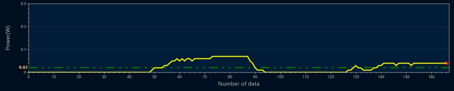 功率图表 :功率图用波形图表示实时功率的波动,如图12,勾选刷新选项后,软件每采集到一个数据,就会把最新的波形显示到图表内。如果不勾选刷新选项,那么可通过鼠标对图形进行移动(左键按下移动),放大缩小(右键按下并移动),以及框选后放大(按下中间移动鼠标)。注:虚线为平均值。
