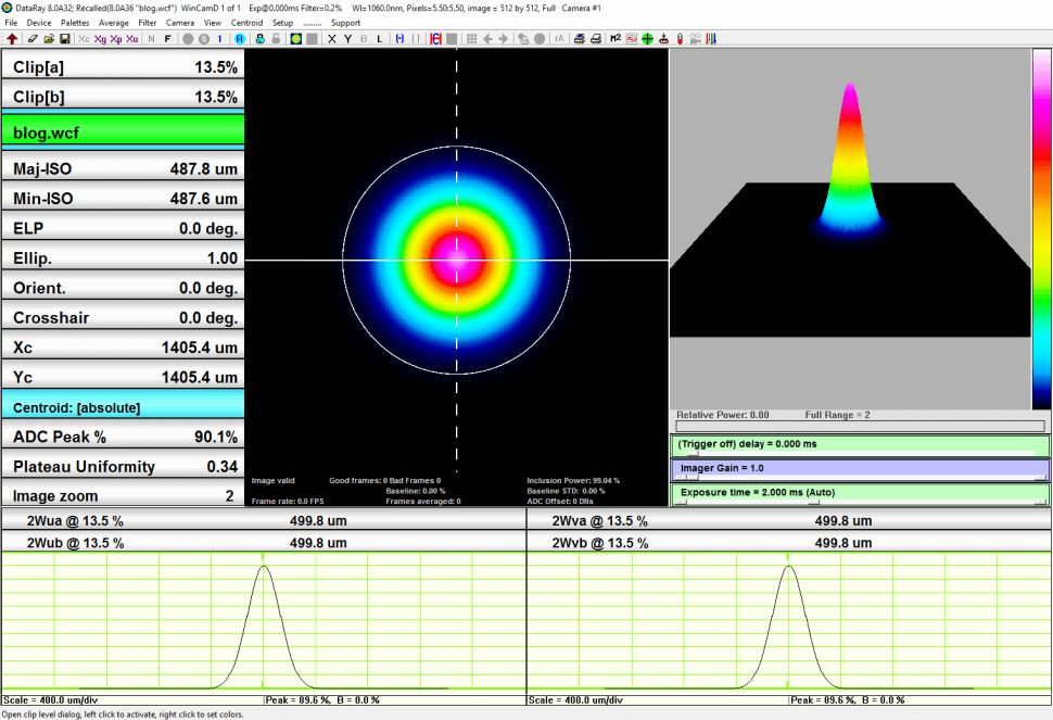 该图片总结:DATARAY软件、光斑分析仪软件显示一个波长为1060nm的激光器,输出了一个质量极高的近似基模高斯光束。它的光斑非常圆(Ellip. ~1.00),尺寸约为488µm,且中心能量高度集中(Peak% ~90.1%)。测量时使用了高强度的衰减片(0.2%)来避免传感器饱和。