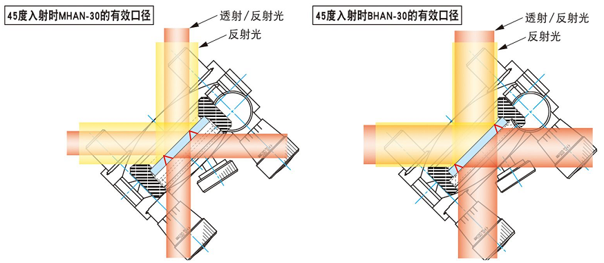 下图是45度入射角的反射及透射的有效直径示意图,方便您通过图片对比西格玛光机BHAN系列万向式分光镜镜架和MHAN系列万向式镜架,直观的感受他们之间的差异。Φ30mm元器件外径的BHAN系列万向式分光镜调整架的45°透射/反射光束有效直径为Φ15.4mm,而HMAN系列万向式镜架的45°透射/反射光束有效直径为Φ9.9mm。