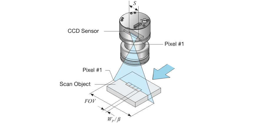光学线扫描相机的原生分辨率由像素数量定义——传感器线中光电元件的行数。线扫描相机可以拥有超过 8000 个像素。扫描系统的分辨率由所选的物镜和图像比例ß'决定,作为图像大小(视场,FOV)与物体大小 S 的比率的函数: