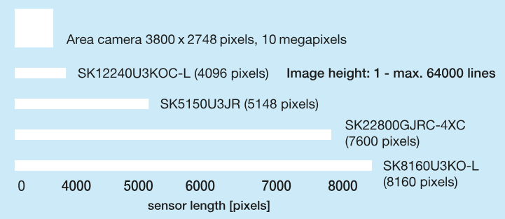 下图将传统区域线扫相机的像素数和可能的分辨率与各种线扫描相机进行比较。与具有较大传感器尺寸的线阵相机相比,1000万像素面阵相机的分辨率会比较低,但是线阵相机的成像高度远超面阵相机,其最大可达到64000行。