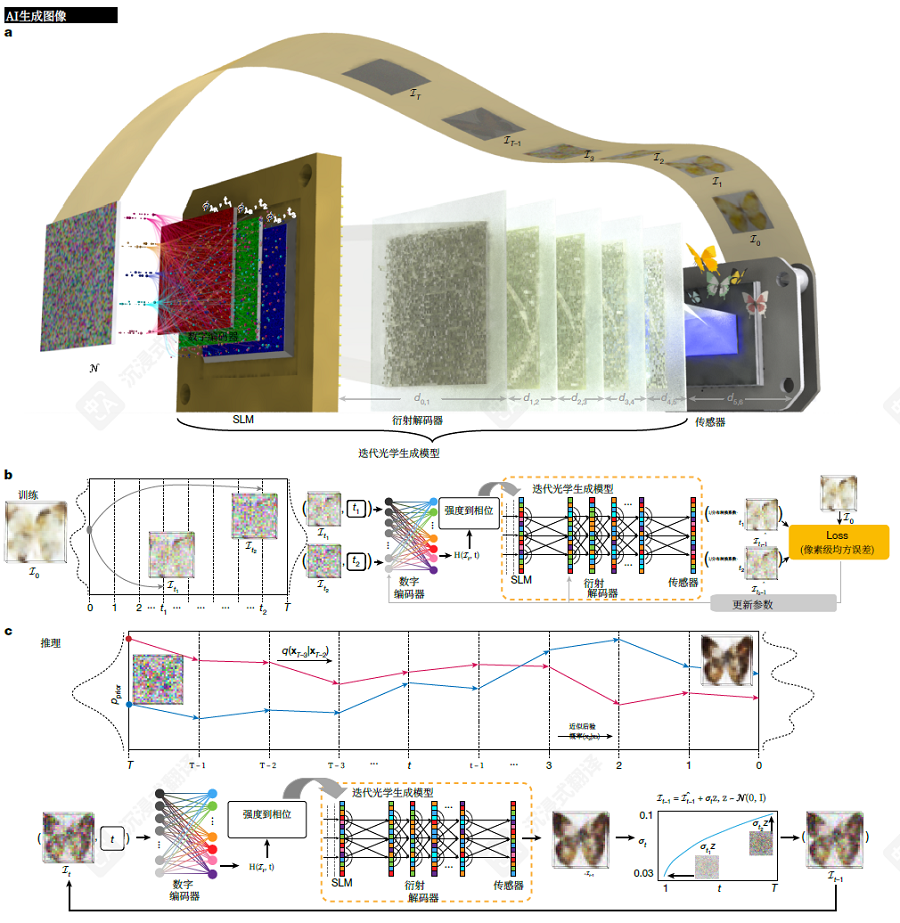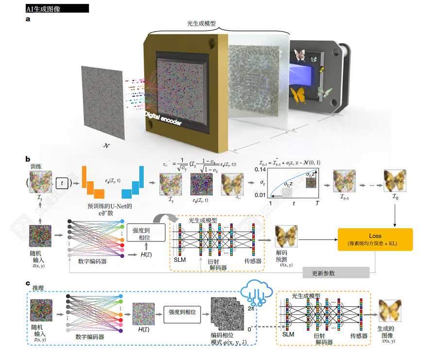 图1|快照光学生成模型的设计。a、b和c面板中的图像为AI生成。a、快照光学生成模型的方案。随机高斯噪声输入首先由浅层数字编码器编码,该编码器创建大量光学生成种子,这些种子被空间光调制器随机访问。输入光场通过可重构和优化的衍射解码器传播后,生成的图像被记录在传感器阵列上。对于给定的目标数据分布,生成光学模型可以合成无数图像。输入光通过衍射解码器生成输出图像的光学传播需要<1ns;然而,图像生成的整体速度受限于输入空间光调制器的刷新时间。b、快照光学生成模型由学习型DDPM训练,DDPM生成的数据对用于指导快照光学生成模型的优化。c,对于图像的盲推理,预先计算的光学生成种子通过云服务器等随机访问,其中快照图像生成通过自由空间光学和波传播在本地实现。d0,1, SLM与衍射解码器之间的距离;d1,2,衍射解码器与传感器之间的距离;εθ噪声预测模型,其中θ表示模型的参数;αt扩散过程中的时变噪声调度系数;z,从正态分布中采样的随机变量;σt在时间步t时添加的噪声的标准差;H,浅层数字编码器的输出;MSE,均方误差;KL,Kullback–Leibler散度;I中间去噪结果;O生成的强度。