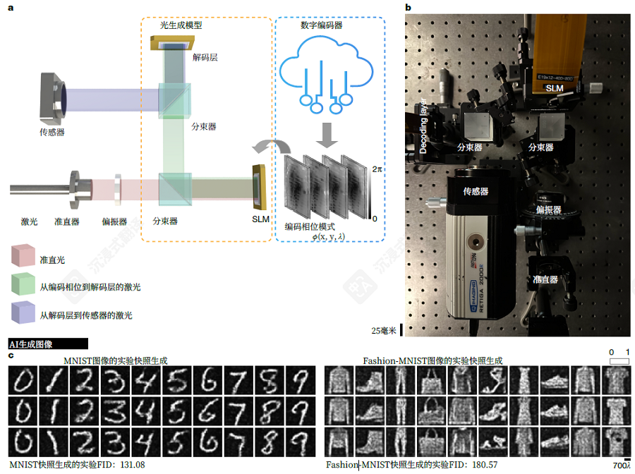 图3|快照光学生成模型的实验验证。使用空间光调制器SLM/偏振器/分束器/准直器,a,我们实验快照光学生成模型的示意图。编码相位模式,即光生成种子,是预先计算的,并且为每个图像推理任务随机访问。b,快照光学生成模型的照片。c,此面板包含AI生成图像。使用分别针对手写数字和时尚产品训练的光学生成模型进行图像生成的实验结果,遵循MNIST和Fashion‑MNIST的目标数据分布。颜色条(用于归一化强度)和比例尺也显示出来。与原始数据集相比的实验FID评估也显示出来。
