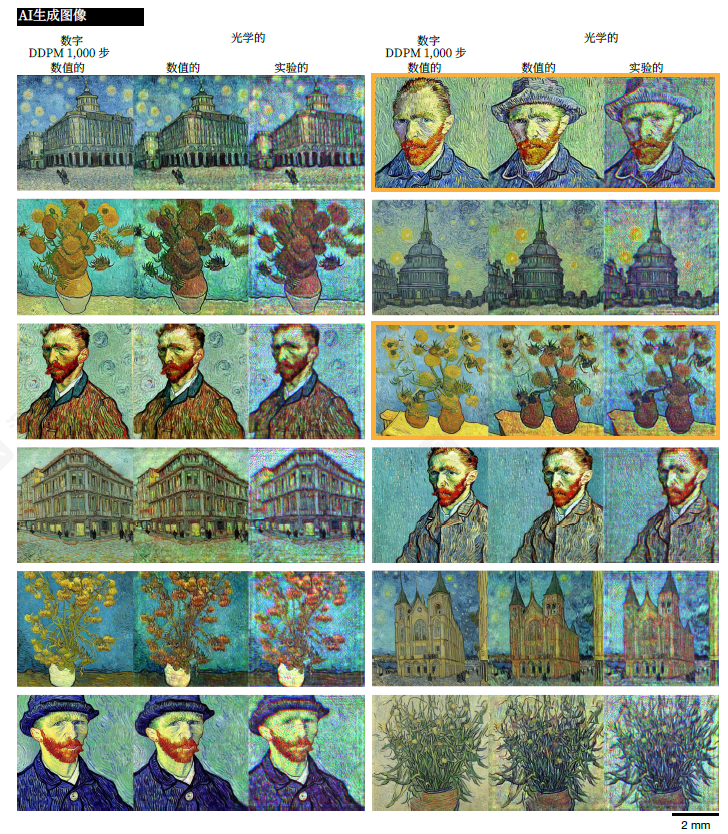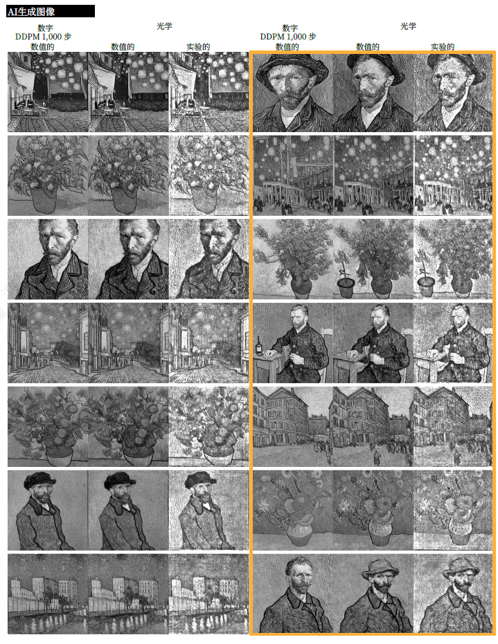 图4|比较了高分辨率快照光学生成模型在单色梵高风格艺术作品生成方面的数值和实验结果,与使用1,000步的教师数字扩散模型进行对比。该图包含AI生成图像。我们展示了数字教师扩散模型(使用1.07亿可训练参数和每次推理使用1,000步)和快照光学生成模型在单色梵高风格艺术作品生成方面的比较结果,以及快照光学生成模型的实验结果。右边的橙色框揭示了快照光学生成模型与数字DDPM教师和光学模型之间观察到的明显差异,展示了快照光学生成模型创建多样化图像的能力,这些图像超出了数字教师扩散模型产生的图像。数字相位编码器有5.8亿可训练参数,每个快照光学图像都是由唯一的随机噪声输入生成的。输入文本(‘架构’或‘植物’或‘人物’)用于生成不同的艺术品。色条和比例尺也显示出来。更多梵高风格艺术作品生成的实验结果在补充图9和10中提供。快照数字DDPM教师和光学模型之间的差异,展示了快照光学生成模型创建多样化图像的能力,这些图像超出了数字教师扩散模型产生的图像。数字相位编码器有5.8亿可训练参数,每个快照光学图像都是由唯一的随机噪声输入生成的。输入文本(‘架构’或‘植物’或‘人物’)用于生成不同的艺术品。色条和比例尺也显示出来。更多梵高风格艺术作品生成的实验结果在补充图9和10中提供。