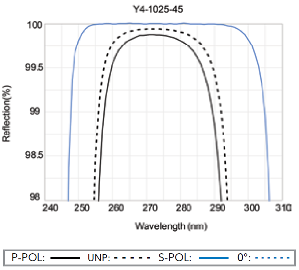 对于266反射镜,反射率和损伤阈值是非常重要的一个参数。CVI的DPSS UV激光器反射镜(266nm反射镜)在科研实验与工业加工中均有广泛的应用,CVI公司推出的266反射镜型号Y4-0525-45,Y4-1025-45,Y4-1537-45,Y4-2037-45,Y4-3050-45和Y4-4050-45。266nm反射镜又称DPSS UV激光器反射镜,或称四倍频Nd:YAG激光器反射镜,通常是应用在Nd: YAG激光器进行4倍频后的激光器上。常用于工业激光加工中的玻璃内雕和塑料打标,科研中的拉曼光谱仪和荧光检测分析。)标准型号Y4-1025-45,Y4-1537-45,Y4-2037-45,Y4-3050-45和Y4-4050-45在对于非偏振光和偏振光的反射率均达到了99.6%以上,对于S偏振光的反射率甚至达到了99.9%。