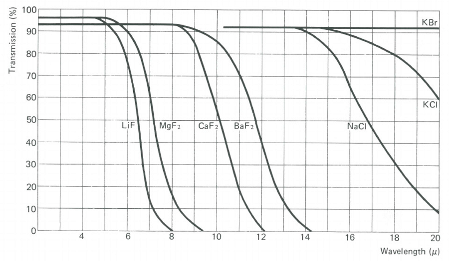 氯化钠是最具代表性的红外透射材料,通常称为岩盐,在高达 16μm 的红外区域用作棱镜、窗片和透镜。