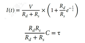 · QLED可建模为RC等效电路,其中Rs为串联电阻,Rd为二极管电阻,C为结电容。