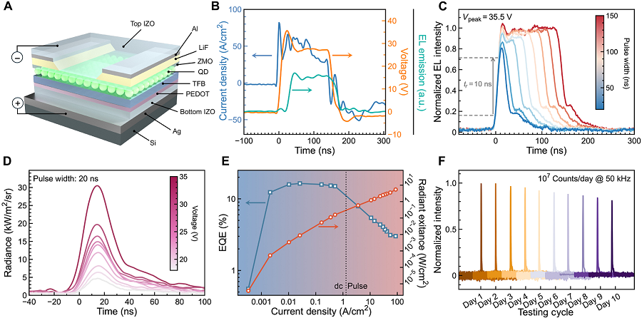 图3.纳秒脉冲EL来自高电流驱动QLED。(A)快速响应Qled的器件结构示意图。(B)由35‑v电压脉冲和150‑ns脉冲驱动的Qled的tRc和el。(C)由35‑v(对应电流密度超过86Acm−2)源驱动的Qled的tRel,脉冲持续时间从20增加到150ns。(D)由20‑ns电压源驱动的Qled的tRel输出,电压从18增加到35v。(E)Qled的eQe和辐射出射度随电流密度的变化。(F)由峰值35v、脉冲持续时间20ns、重复频率50khz的电压源驱动的Qled的纳秒脉冲EL稳定性测试。