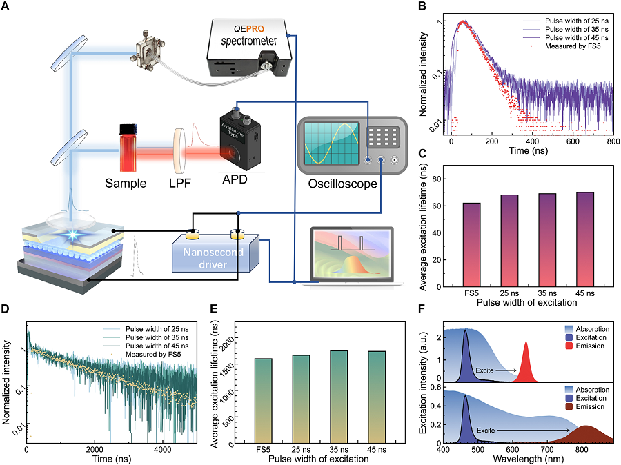 图4.纳秒脉冲QLED在时间分辨荧光光谱中的应用。(A)tRPl光谱的家制装置示意图。tRPl曲线的(B)红色Qd和(D)红外Qd溶液由具有不同脉冲宽度的Qled和商业爱丁堡FS5光谱仪激发。平均激子寿命的(C)红色Qds和(E)红外Qds。(F)Qd溶液的吸收和Pl光谱以及蓝色Qled激发源的el光谱。