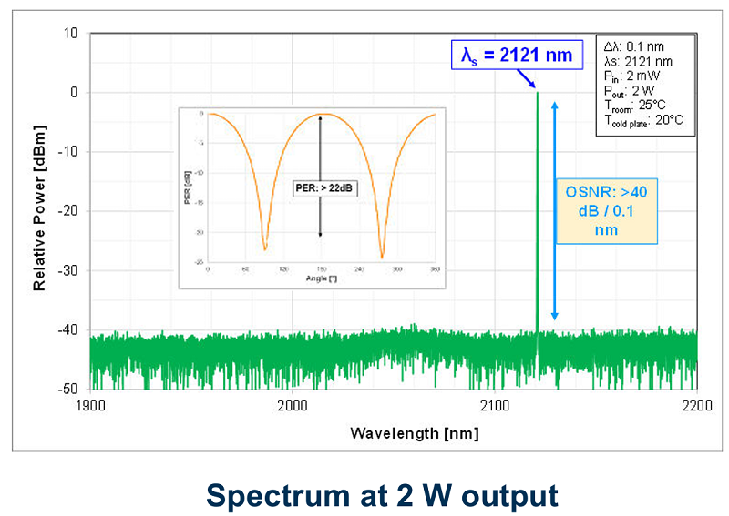 氢气检测光放大器CALIPSO放大器输出功率为最大2W时的光谱特性。信噪比在0.1nm分辨率带宽下大于40dB,表明输出激光的纯度高,背景噪声极低。掺钬光纤激光放大器偏振消光比大于22dB,,表明激光具有极好的线偏振特性。