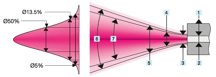 1:单模光纤、2:纤芯直径、3:模场直径、4:强度水平(13.5%水平)、5:强度水平(例如5%)、6:2倍NA(例如5%水平对应)、7:2倍NAe²(13.5%或1/e²水平对应)。对于短波长光纤,其数值孔径随波长变化,并非如标准模型或通信光纤所假设的那样恒定。对于单模光纤和保偏光纤,NAe²通常随波长的增加而略有减小。因此,需要针对几个典型波长去测量对于的NAe²。这也是上文提到的通过模场直径来重新确定制成后的光纤数值孔径的局限性:仅在能实现单一波长下测量,会忽略其随波长的变化。