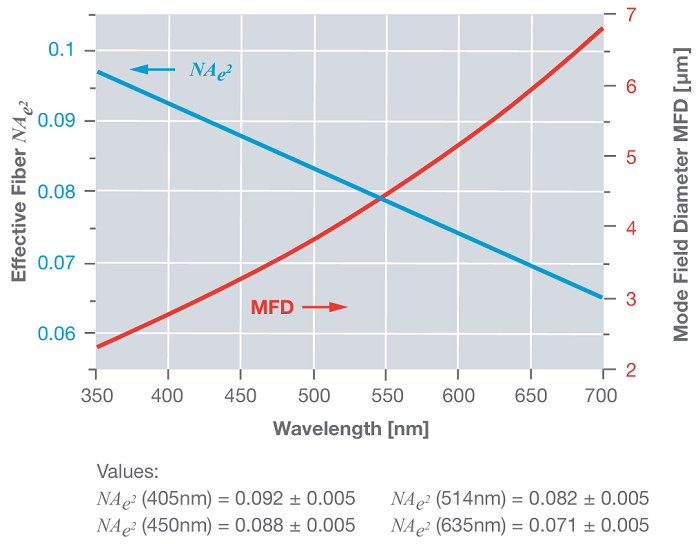 图1:适用于400nm至640nm波段的RGB光纤,其波长与有效数值孔径(NAe²)及对应的模场直径(MFD)的关系。如图所示,NAe²随波长增加而显著减小。