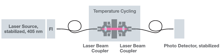 光纤能显著提升测量设置的稳定性与便捷性,可以使用稳定、紧凑、可便携的密封光纤系统替代大型光学平台式设置。任何光纤系统的稳定性在很大程度上取决于所用激光耦合器,在保偏光纤输入输出端的稳定性。在针对焦距4.5毫米、波长405纳米的激激光耦合器的测试中,15°C至35°C的温度循环下,实现了功率稳定性典型最大偏差为3%的结果。这种高稳定性是光纤设备成功应用的基础。另外对有效光纤数值孔径的精确测量,为选择最合适的耦合与准直光学元件提供了依据。