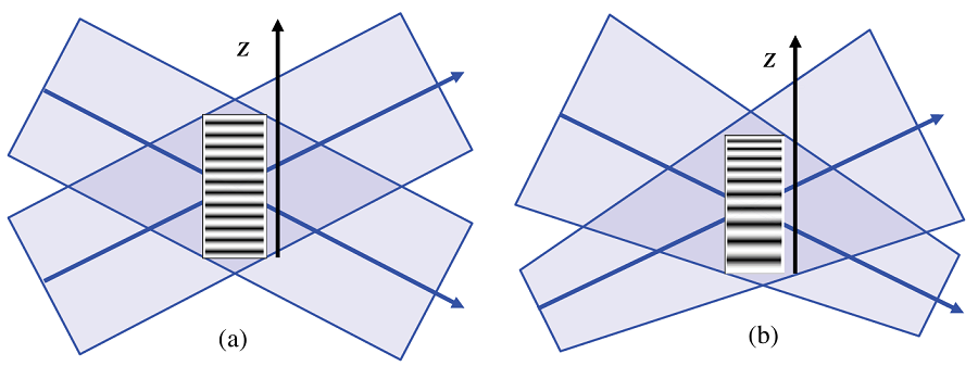 图1:均匀光栅的几何结构:(a)由准直光束干涉产生;(b)由会聚光束和发散光束干涉产生。