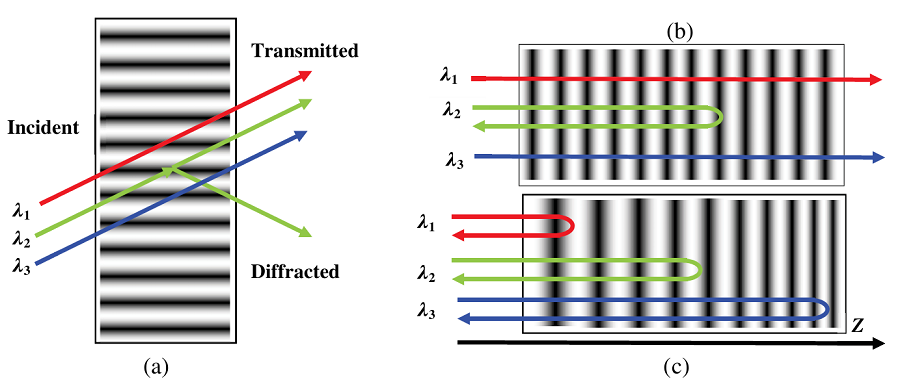 (a)透射光栅,(b)均匀反射光栅(布拉格镜),(c)啁啾反射体布拉格光栅,λ1>λ2>λ3。