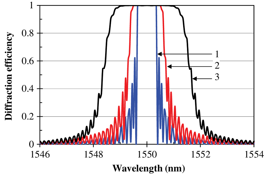 图3:不同光谱调制率(SCR)下无损反射光栅的衍射效率模拟光谱。建模参数:中心波长λ₀=1550nm,空间折射率调制δn=700ppm,厚度T=5mm。SCR dλ/dz(nm/cm)分别为:1–0、2–0.5、3–5。